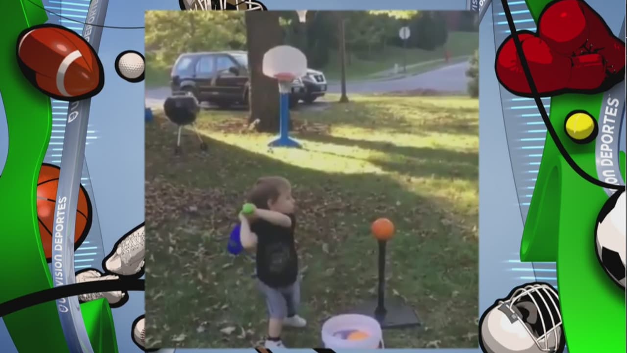 El pequeño de dos años de edad combina a la perfección ambos deportes y enseña cómo se puede batear una pelota y que esta haga canasta. Aquí una muestra de su gran talento.