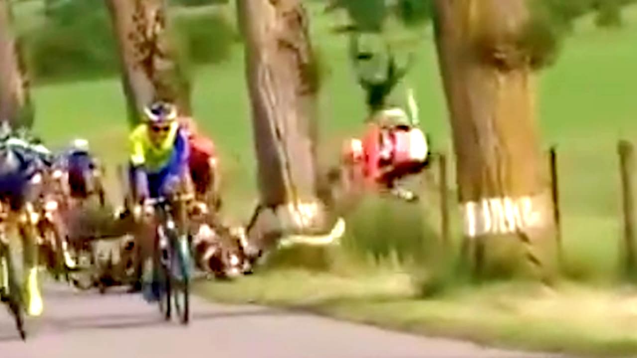 Durante el Tour de Luxemburgo, este corredor fue arrollado por detrás y terminó volando por los aires, tras chocar de frente contra un árbol. Aquí la terrible caída.