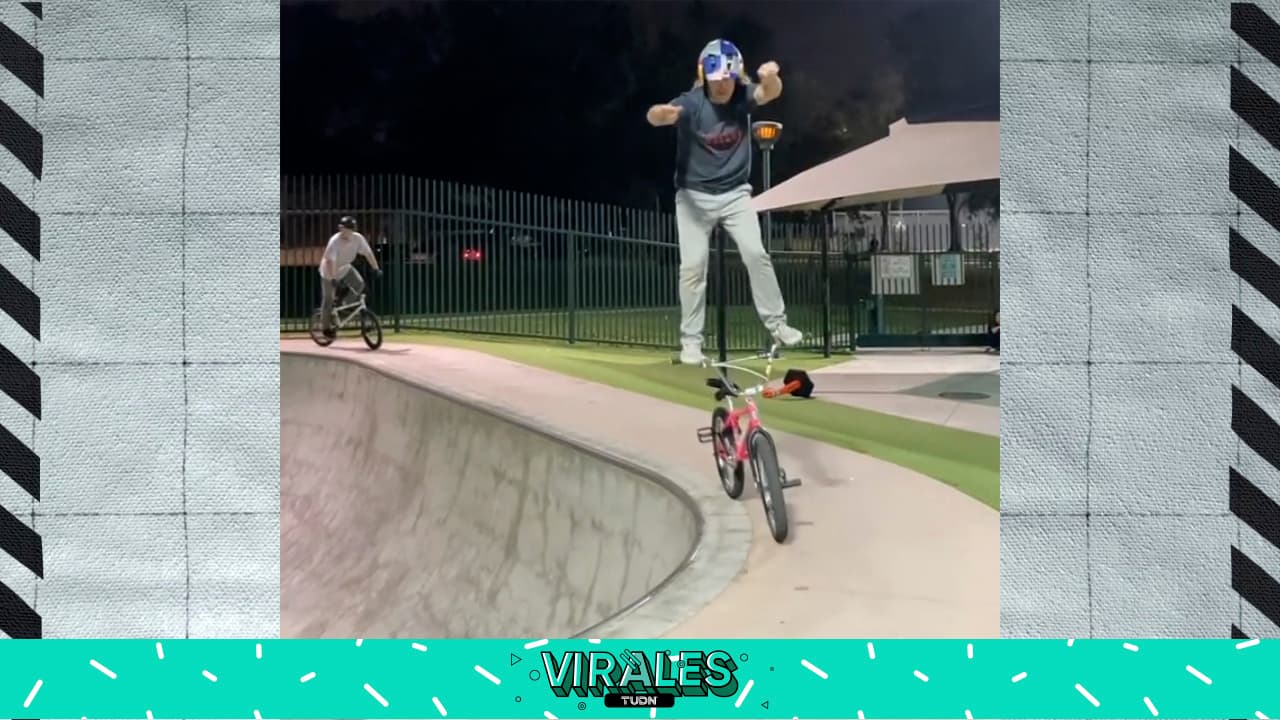 Mike "Hucker" Clark, piloto de BMX, realizó una increíble acrobacia parado sobre el manillar de su bicicleta.