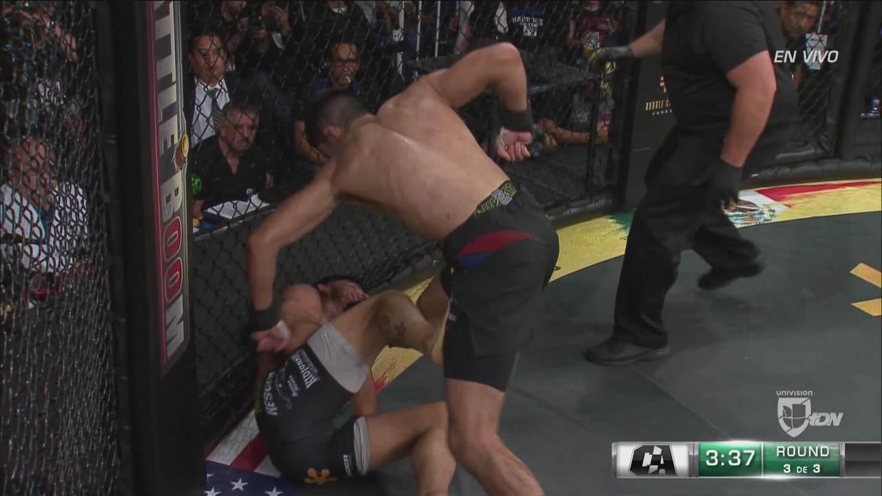 Eduardo Torres, de Chile, fue muy superior a su rival y terminó noqueándolo al inicio del tercer asalto con un buen intercambio de golpes en el suelo de la jaula.
