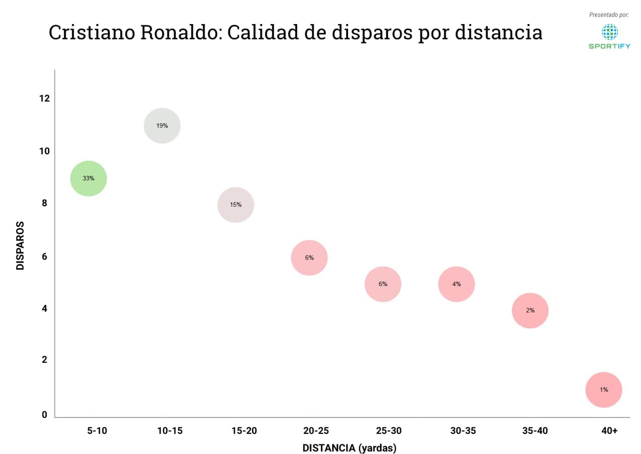 Ronaldo hizo 49 disparos en seis partidos, pero muchos de esos desde lejos - y de probabilidades bajas. En el gráfico, se ven 21 disparos de más de 20 yardas de distancia de la portería. Ronaldo anotó un solo gol de esos 21 disparos. La mayoría de sus tiros entonces resultan siendo posesiones desperdiciadas – debido a que la probabilidad de que esos disparos se convirtieran en gol fue muy pequeña. Incluso para Ronaldo.
