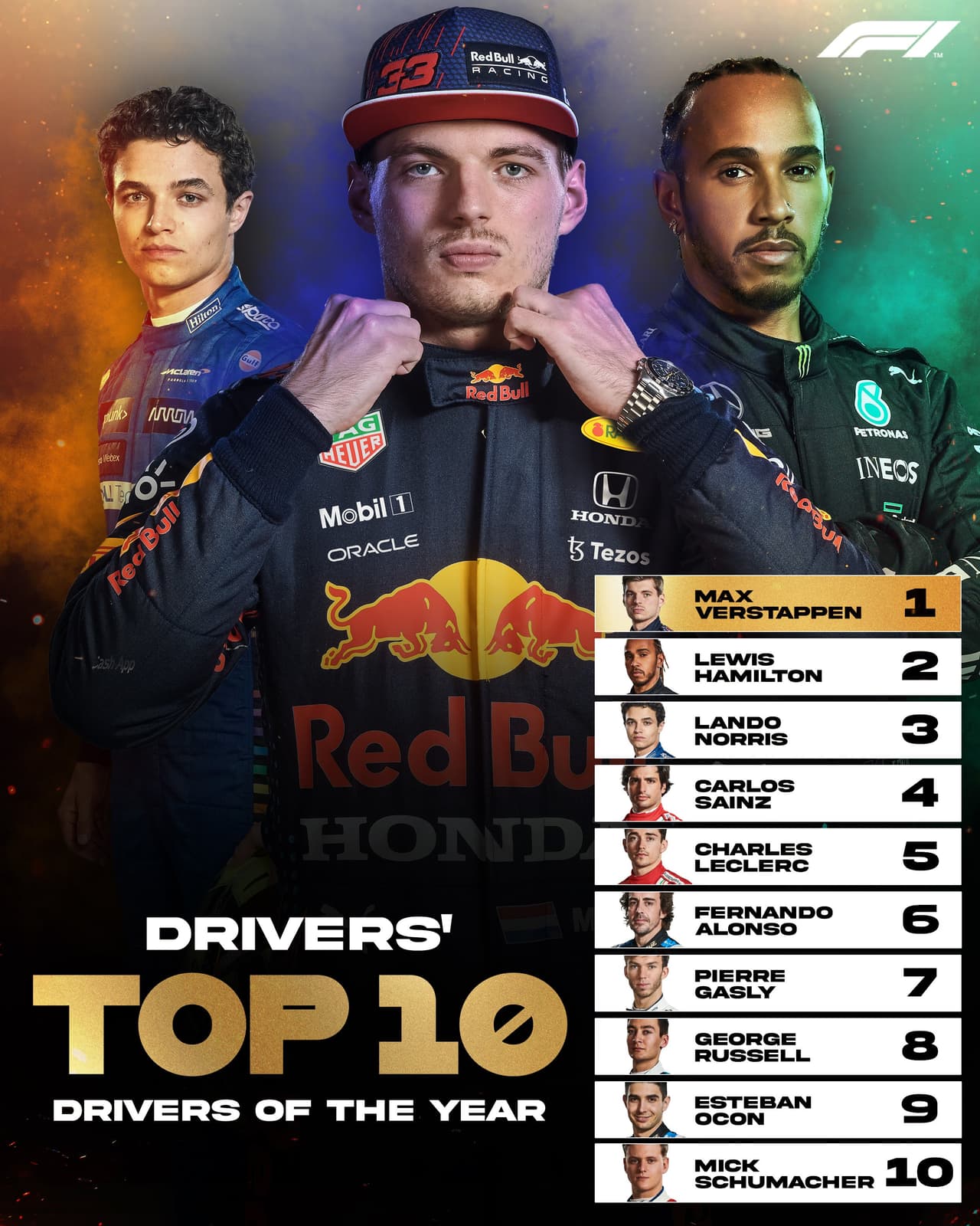 A pesar de los sacrificios en la pista para ayudar a conseguir el campeonato para Max Verstappen, Checo Pérez no aparece en este listado que votan los pilotos, como tampoco lo están Daniel Ricciardo, ni Valtteri Bottas, quienes sí estuvieron entre los 10 mejores en el estado del campeonato de pilotos del Campeonato Mundial de la Fórmula 1.
