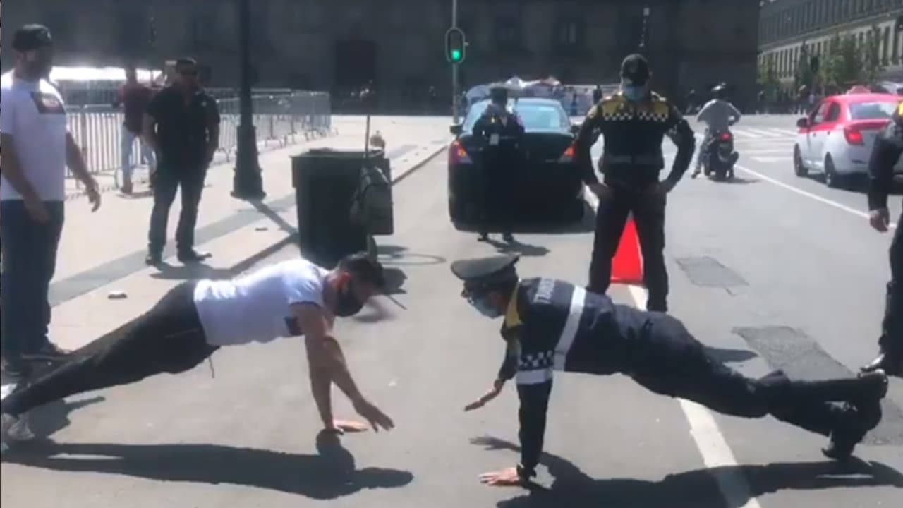 El integrante de la Subsecretaría de Control de Tránsito de la capital mexicana, retó a uno de los manifestantes a un duelo lagartijas con un giro particular y de alta dificultad: tocar las palmas de sus manos.