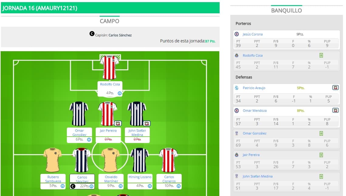 La Jornada 16 del Univision Deportes Fantasy llegó a su fin, arrojando como ganador de esta fecha a Amaury12121, quien logró sumar 87 puntos en su equipo.