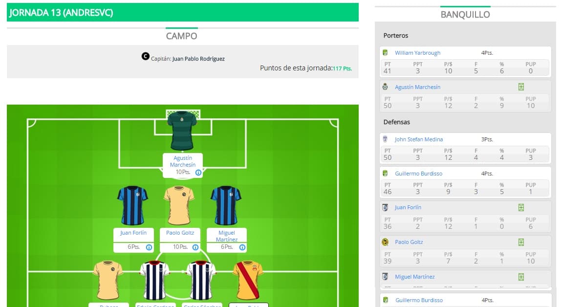 La J13 del Univision Deportes Fantasy llegó a su fin, arrojando como ganador a Andresvc, quien logró sumar 117 puntos en su equipo.