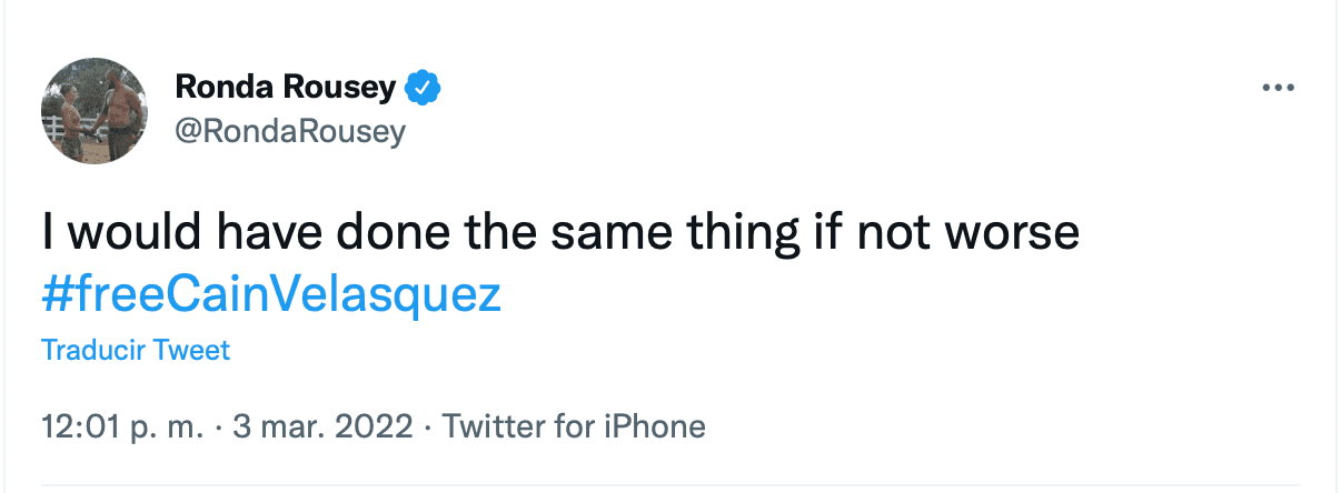 Según versiones de la propia policía, Velásquez intentó dispararle a un hombre que abusó de un familiar menor de edad, por lo que Rousey mencionó que habría hecho lo mismo si hubiera estado en su lugar.