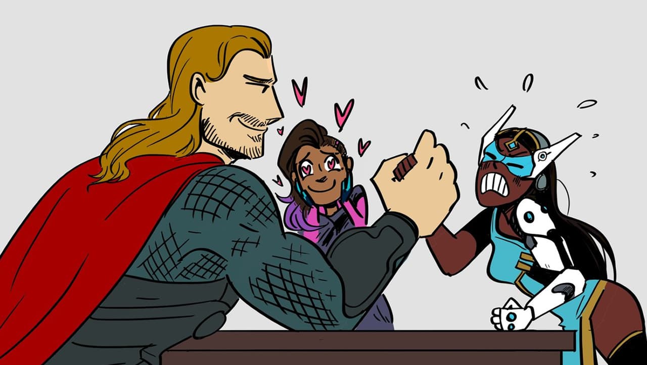 So, it happened: #Thor vs. #Symmetra, arm wrestling for Sombra's #boop. Tx @chrishemsworth @carolinaravassa @SupanovaExpo #sombra #gunshow pic.twitter.com/3tfpi6Xcih