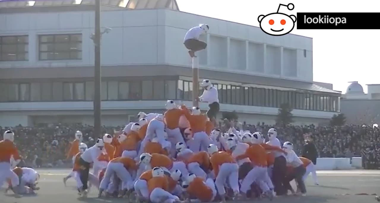 El Bo-taoshi se practica en las fiestas escolares en el país asiático y consiste en dos equipos de 150 integrantes cada uno.