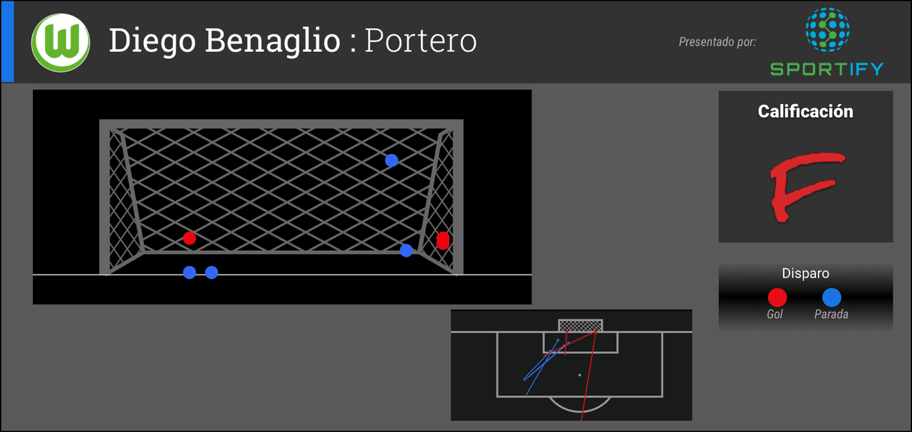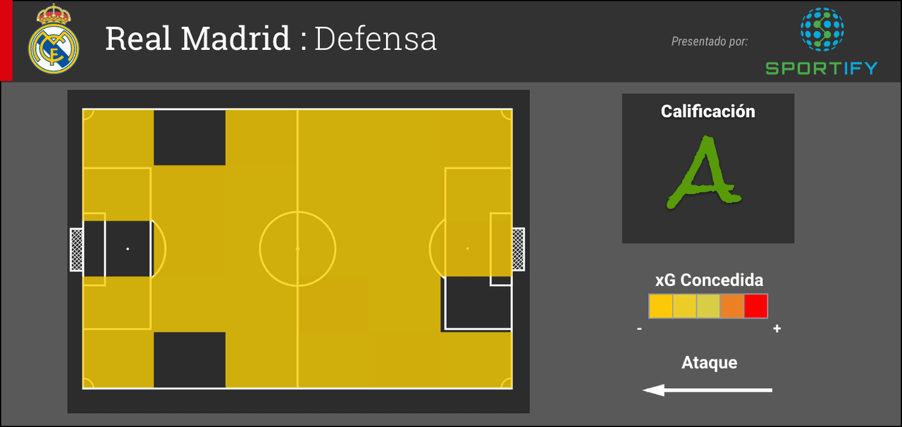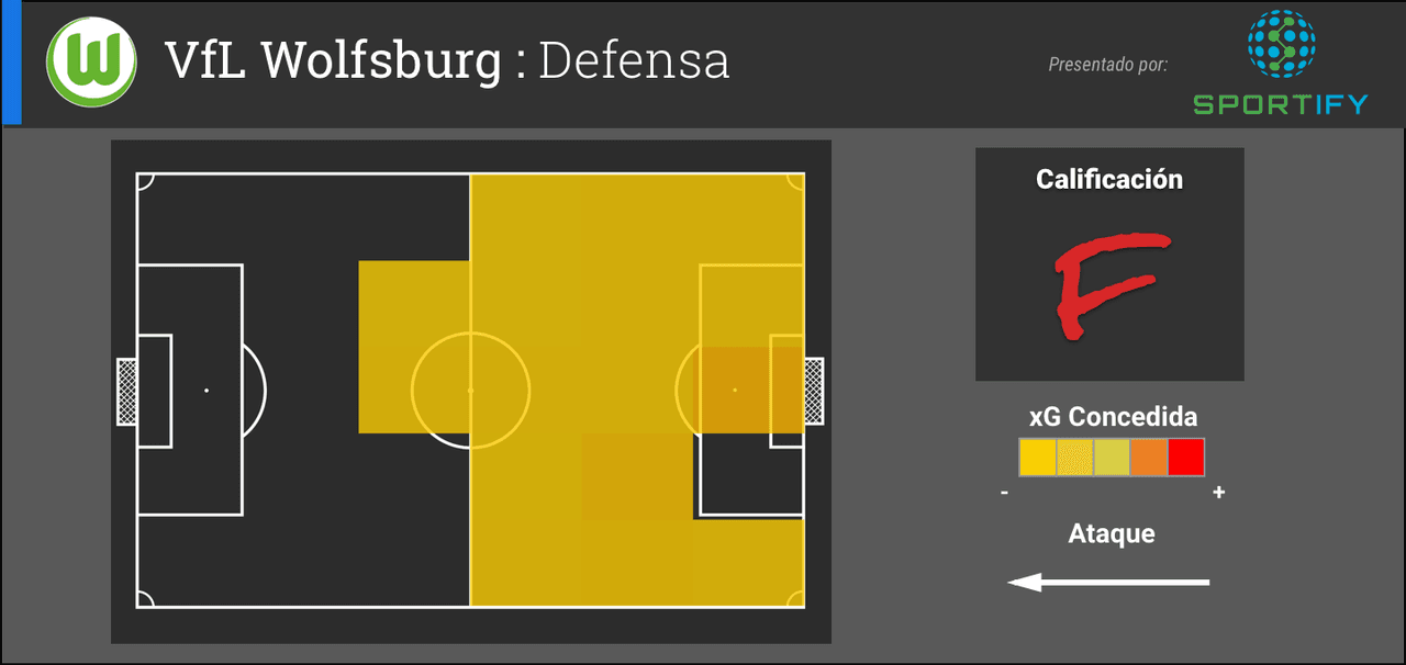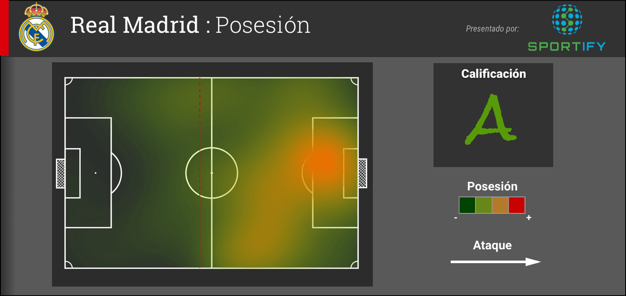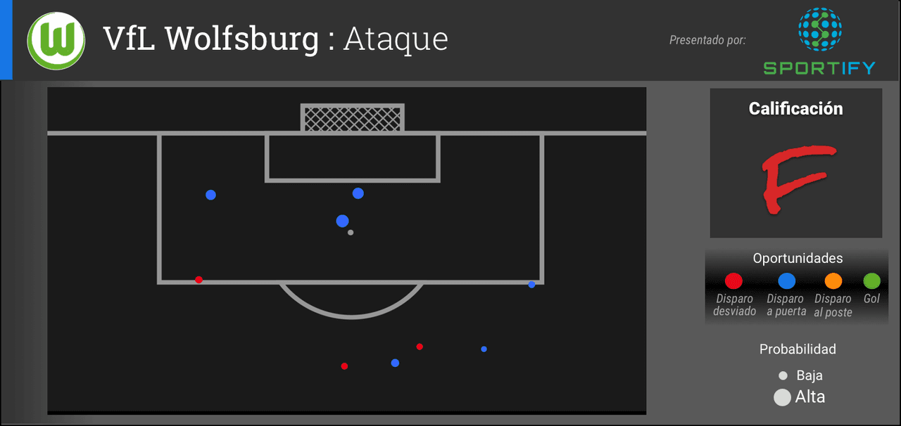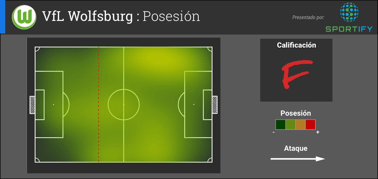 Todas las posesiones del Real Madrid terminaron en áreas de peligro para su oponente. El color en la visualización de los merengues se intensifica frente a la meta del equipo alemán, y la línea punteada roja indica que los inicios de la posesión del Real Madrid están mucho más adelantados en comparación a los del Wolfsburgo. La visualización del Wolfsburgo demuestra claramente que los lobos no se acercaron a la portería del anfitrión.