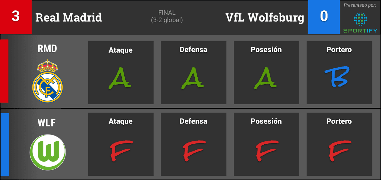 Real Madrid avanza a su sexta semifinal consecutiva de la Champions League. Después de 90 minutos, el partido termino 3 a 0 (3-2 global). Aquí, las calificaciones de cada equipo en el ataque, la defensa, la posesión y la portería: