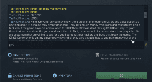 Recientemente se han reportado hackeos menores en lobbies del juego, conversaciones públicas e incluso partidas privadas donde un “jugador preocupado” a través de bots hace un llamado a todos los usuarios a dejar de jugar un dia para mostrar a Valve lo mucho que les importa.