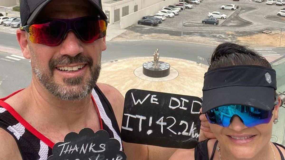 Una pareja sudafricana corre un maratón en su balcón
