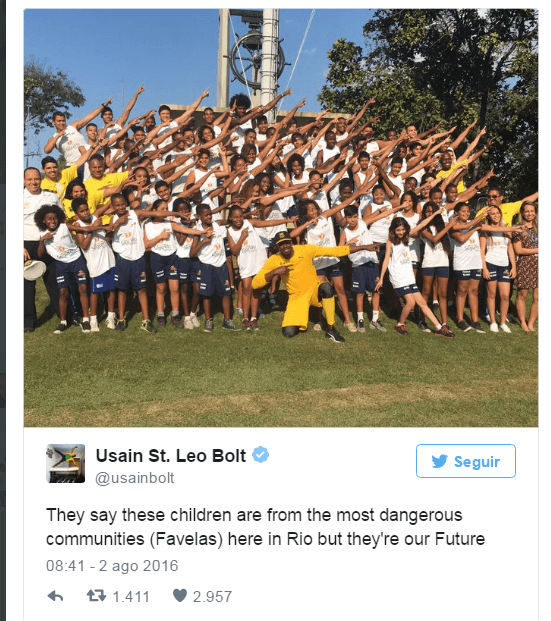 Usain Bolt visitó a niños de una favela previo al arranque de los Juegos Olímpicos; el jamaiquino publicó una fotografía en su cuenta de Twitter con el mensaje: "Dicen que estos niños pertenecen a una de las comunidades más peligrosas de Río, pero son nuestro futuro".