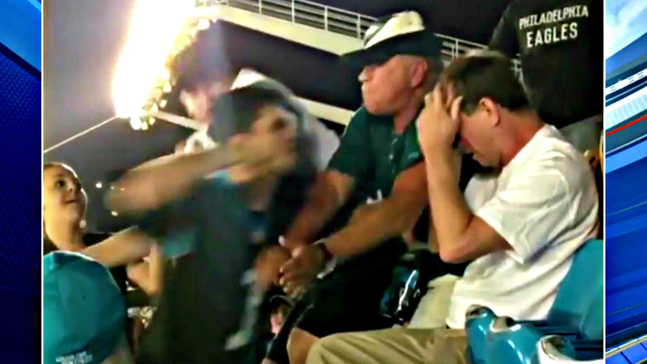 En el partido entre Carolina Panthers y Philadelphia EaglesPanthers, en el Bank of America Stadium, un aficionado le rompió el pómulo a un señor de la tercera edad. Aquí, el atroz instante.