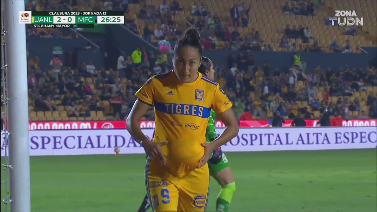 Diagonal de Ovalle que Stephanie define pegado al poste y celebra con el balón en la panza y arrullando al niño porque será mamá.