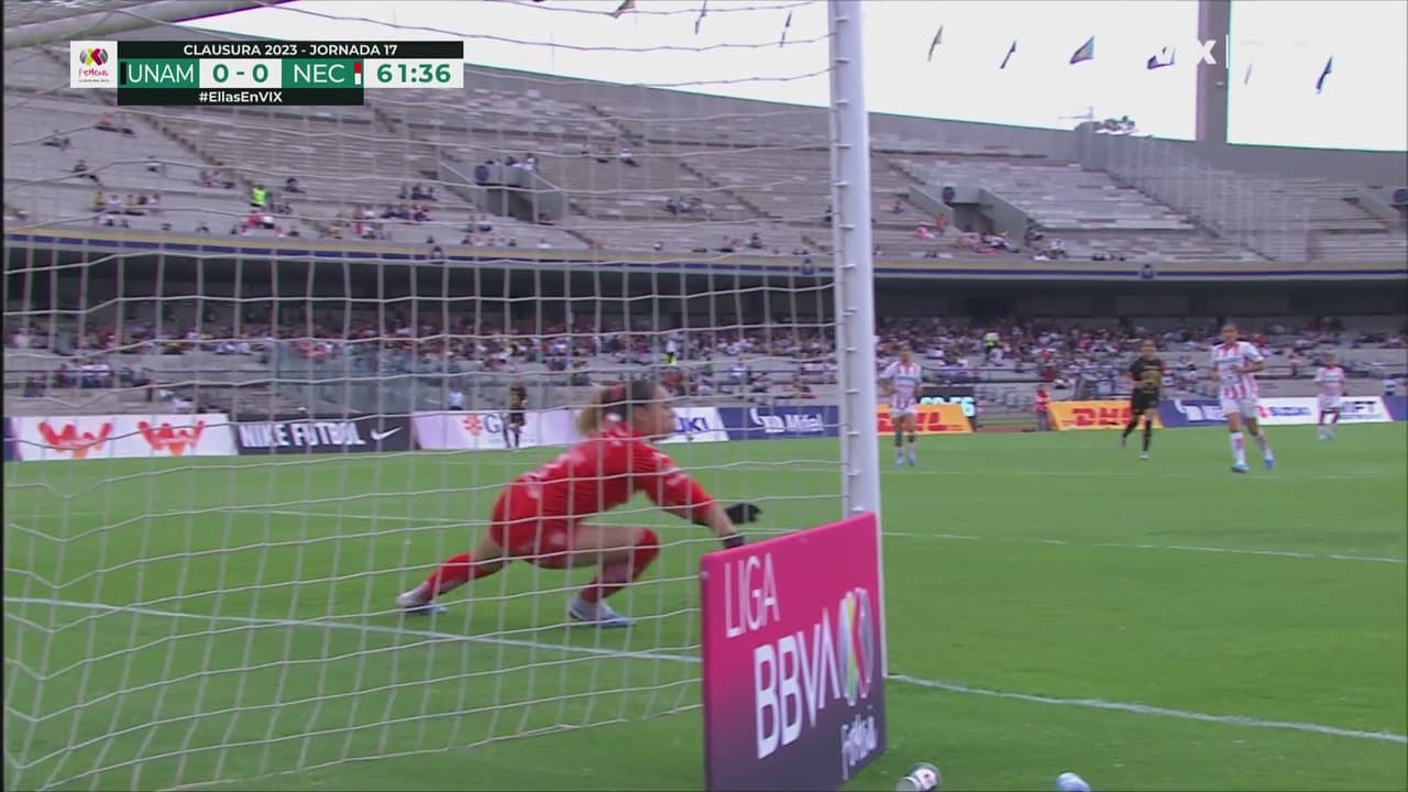 La delantera de Pumas metió un potete disparo que amenzaba con colarse y la arquera rojiblanca atajó arriesgando el físico.