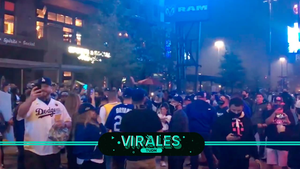 Aficionados de los Dodgers celebran el triunfo del quinto juego