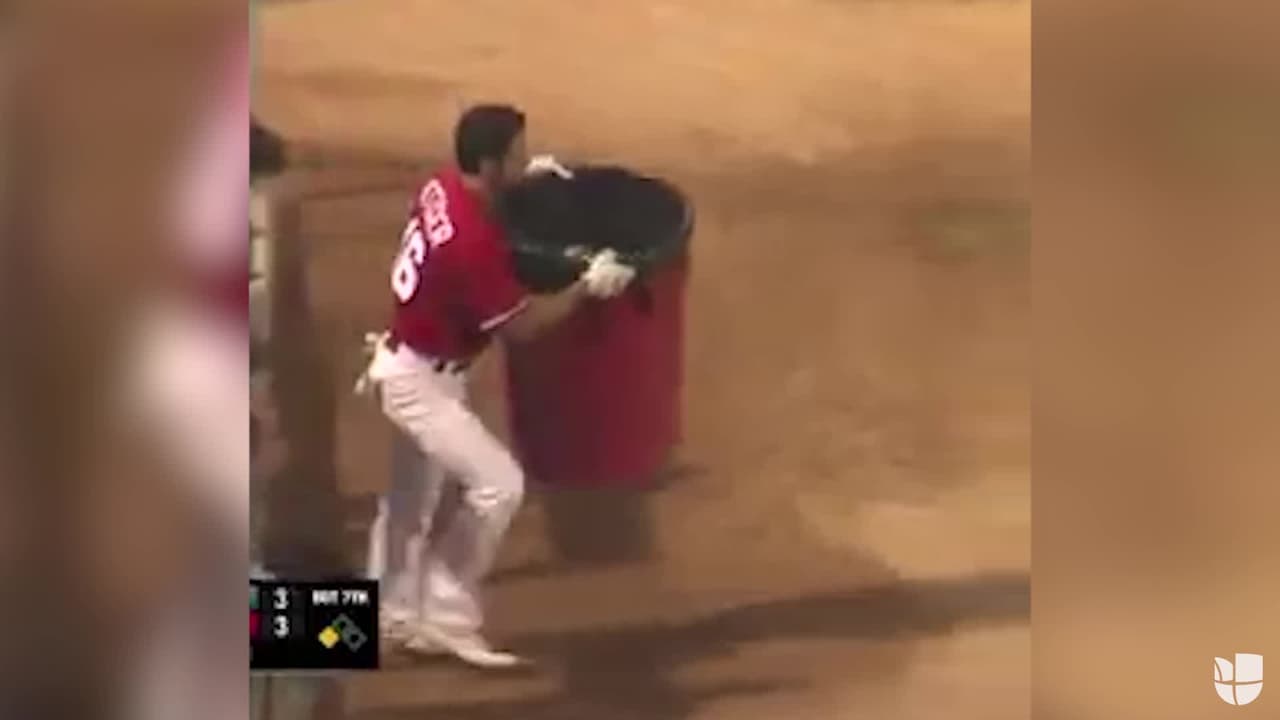 El berrinche más creativo: beisbolista reclama con bote de basura