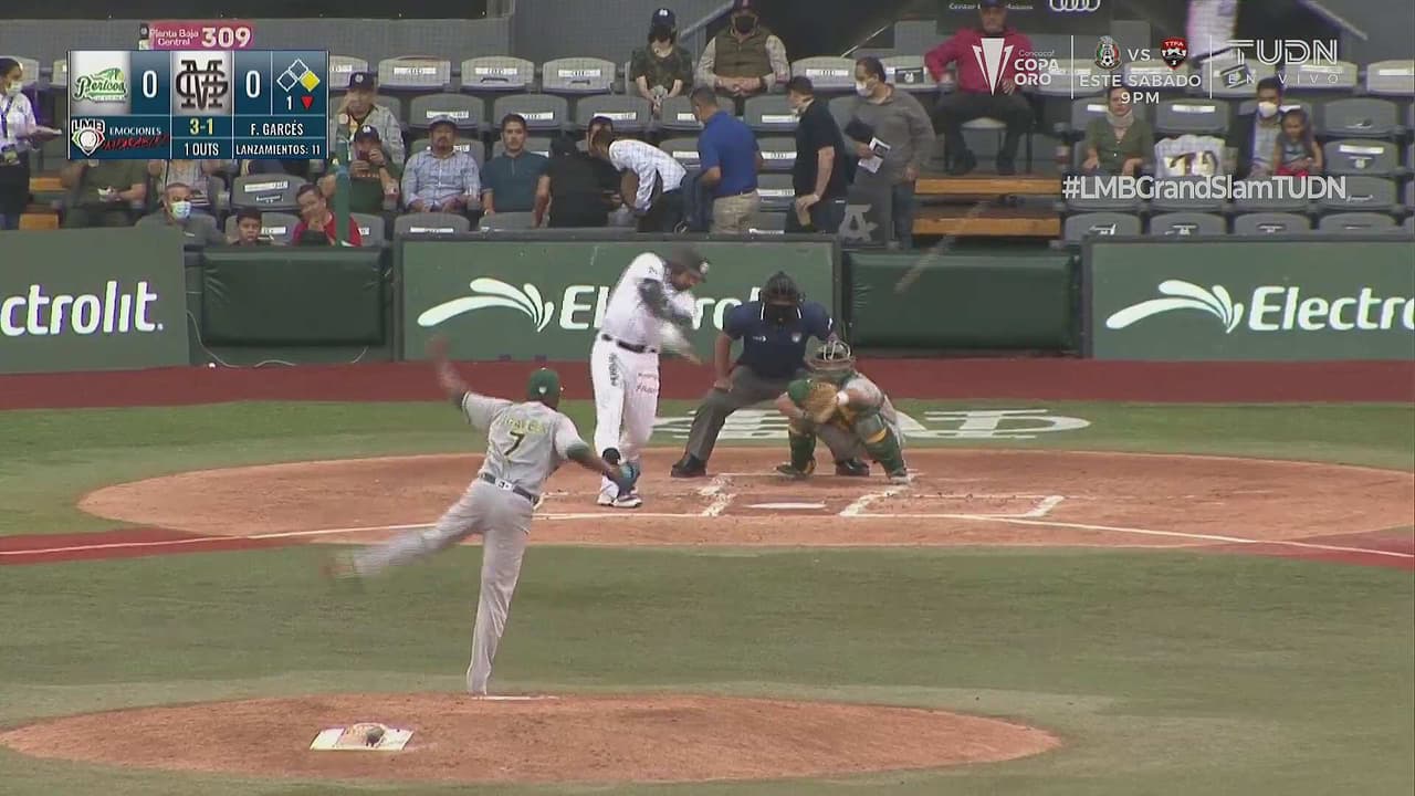 El mexicano manda la pelota contra la barda del jardín izquierdo y Luis Sardinas anota.