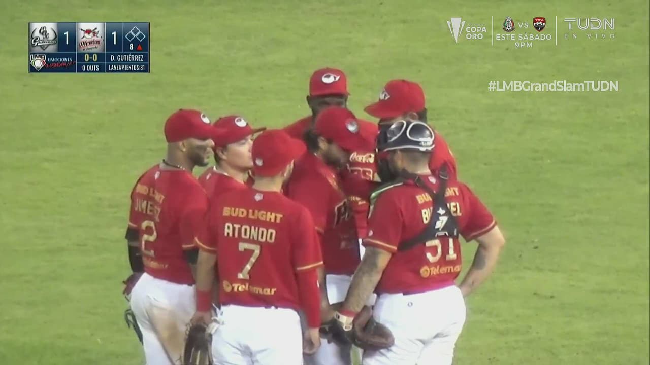 Gutiérrez recibe batazo de cuatro esquinas de Juan Camacho en la parte alta del octavo rollo.