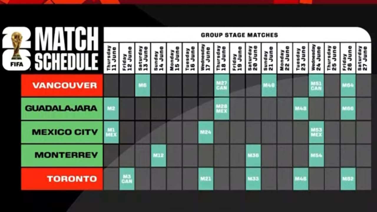 - Vancouver: BC Place (54,500): 5 partidos de fase de grupos, incluyendo dos de la Selección de Canadá; 1 partido de dieciseisavos, 1 de octavos