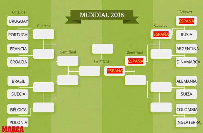 Parece que el pesimismo del Grupo F en el que México participará al lado de Alemania, Suecia y Corea del Sur, no es exclusivo de los fanáticos mexicanos. En España, el diario Marca hizo un ejercicio en el que hablaban de la posibilidad de que su selección sea campeona del Mundo y como sería el camino de ‘La roja’ rumbo al campeonato. Sin embargo, en el camino rumbo a la supuesta obtención de la Copa del Mundo, los ibéricos no consideran a México como el equipo que avanzará al cruce de los octavos de final.