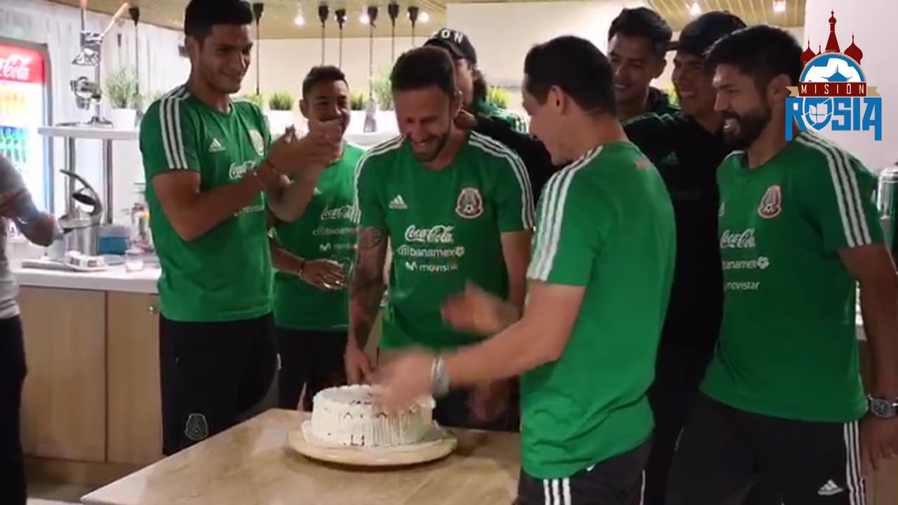 El jugador del Tri y del Sevilla recibió tremendo 'regalo' cuando algunos compañeros y su propia esposa lo sorprendieron con un pastelazo por su cumpleños 30 que cumplirá este lunes.