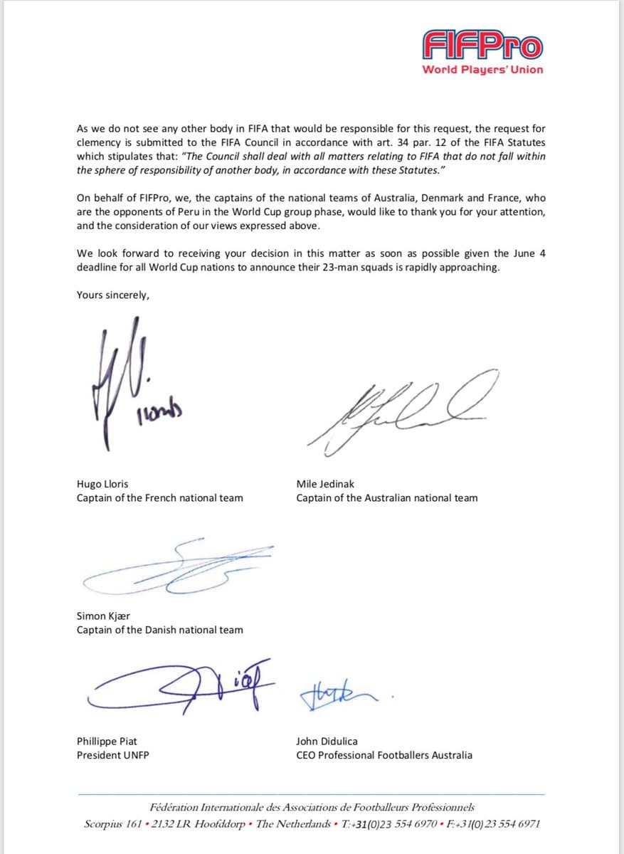 Los capitanes de las selecciones anteriormente mencionadas ( Hugo Lloris, Simon Kjaer y Mile Jedinak) han pedido, mediante un comunicado del sindicato internacional de Futbolistas Profesionales (FIFPro), que el capitán de Perú juegue el Mundial de Rusia 2018.