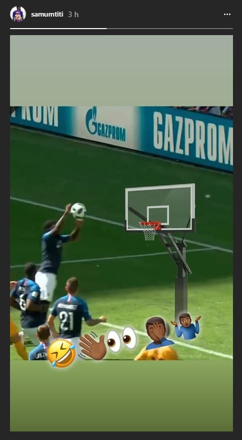 A final de cuentas los ‘Blues’ terminaron ganando el cotejo con una anotación de Paul Pogba, pero Umtiti no quiso dejar pasar su error por alto, sabe que se equivocó y por ello prefiere reírse de la situación para afrontarla. El central del Barcelona publicó en sus historias de su cuenta de Instagram un meme en el que se le ve alcanzando el balón, como si estuviera retacándolo en una canasta de baloncesto.