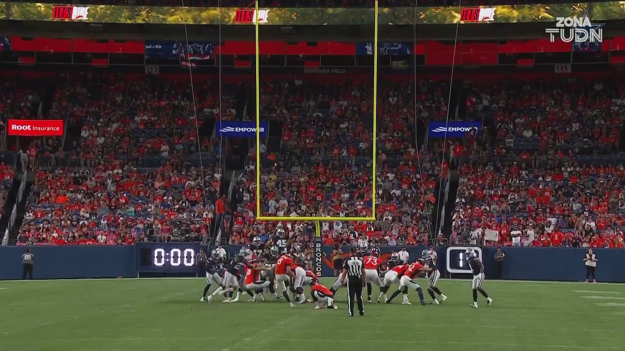 Brandon McManus logra tres puntos más para Denver en la última jugada de la primera mitad.