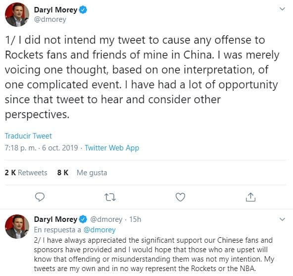 Y en un segundo mensaje añadió: “Siempre he apreciado el significativo apoyo de nuestros aficionados chinos y patrocinadores y esperaría que quienes están molestos sepan que no fue intención ofenderlos ni malinterpretarlos. Mis mensajes (tuits) son de mi autoría y no representan de ningún modo a los Rockets ó la NBA”.