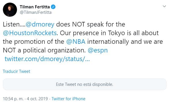 Pero en el ánimo de evitar represalia de cualquier tipo, Tilman Fertitta, propietario de la organización quiso aminorar las cosas respondiendo esa misma publicación con un tuit donde dice: “Escuchen, Daryl Morey NO habla por los Houston Rockets. Nuestra presencia en Tokio es sólo para promocionar a la NBA internacionalmente y no somos una organización política”.