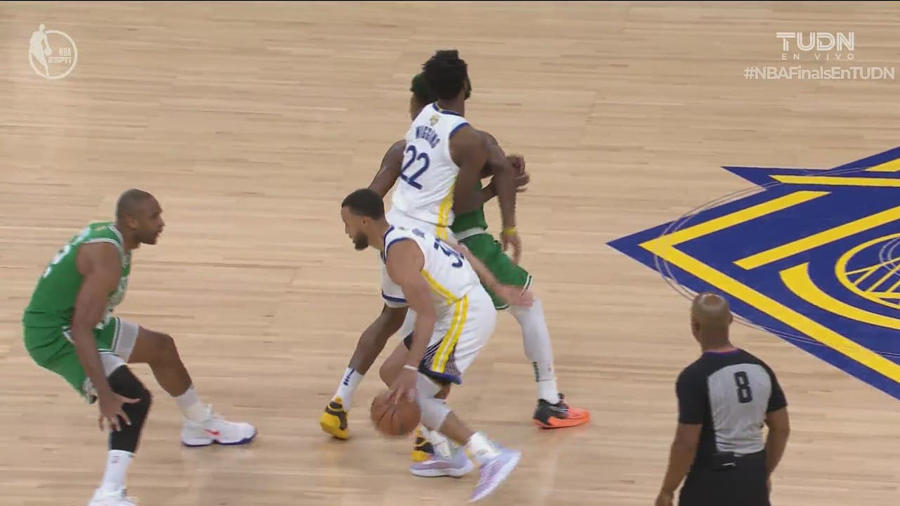 El base de Golden State es protegido para poder lanzar desde la línea y sumar tres unidades.