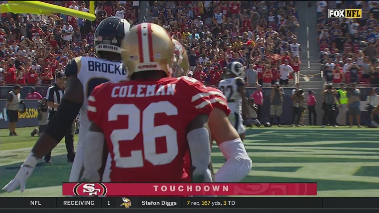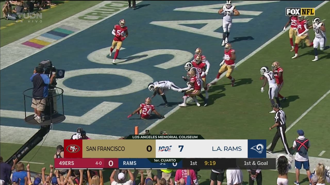 En el primer cuarto Robert Woods sorprendió con una jugada reversible, para acarrear el ovoide 8 yardas hasta las diagonales y dio la ventaja a los Rams, pero Tevin Coleman respondió por los 49ers y empató el encuentro 7-7.