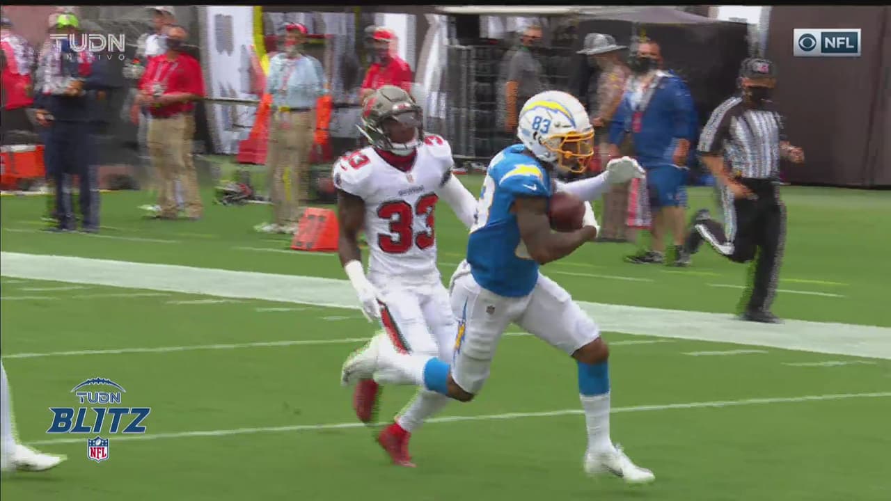 El QB de Chargers presumió su brazo con un largo pase para empatar 7-7 el partido con Buccaneers.