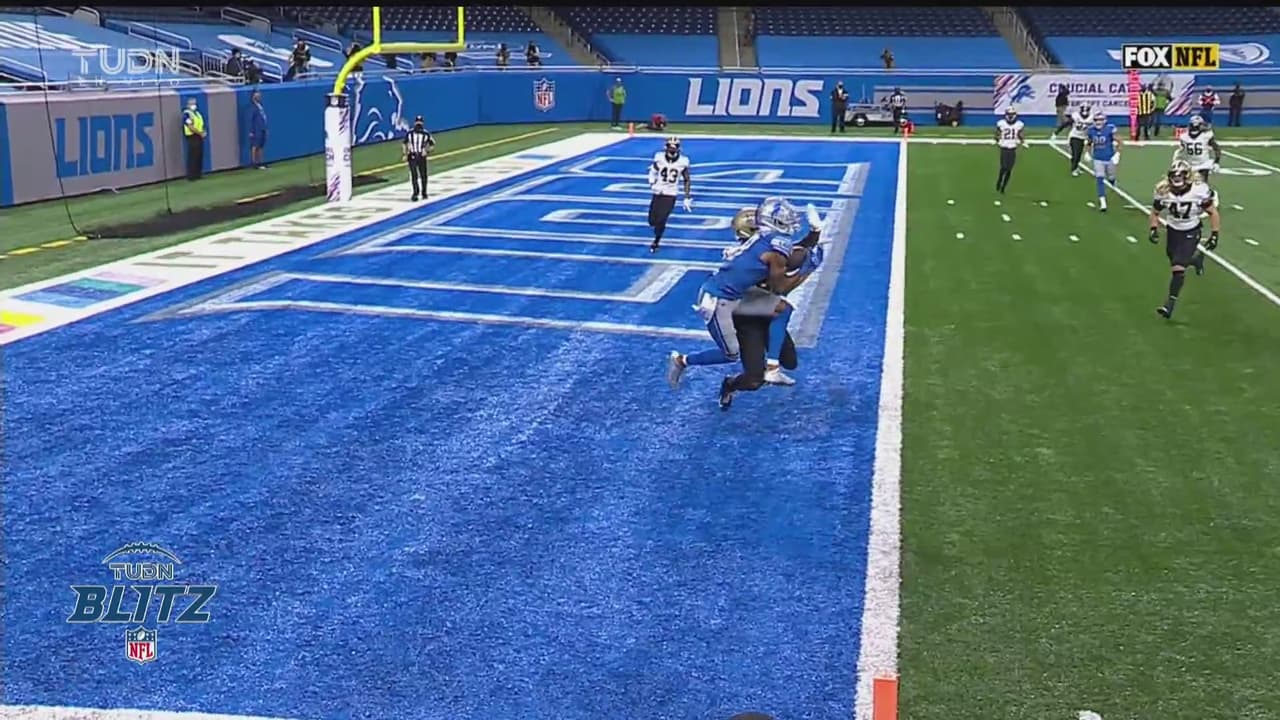 Kenny Golladay recibe el pase en las diagonales y Detroit le está ganando a New Orleans.