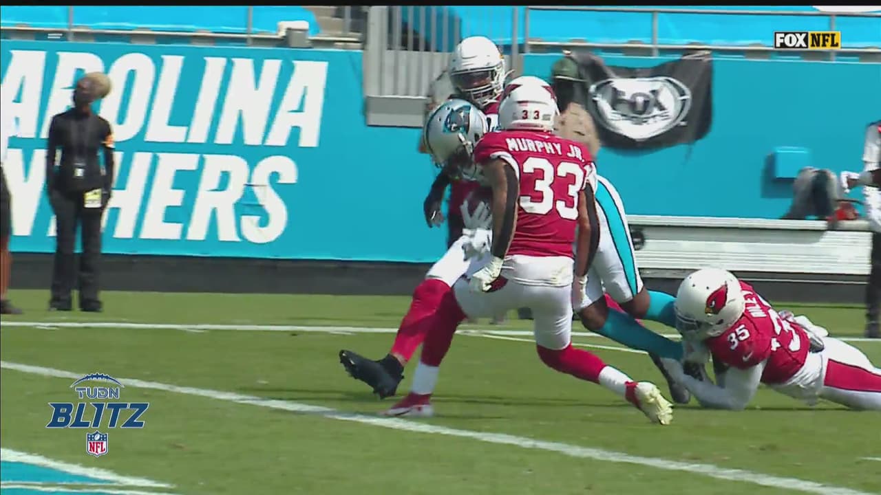 Fenomenal acarreo del QB de Carolina para dejar rivales de Arizona en el suelo y anotar.