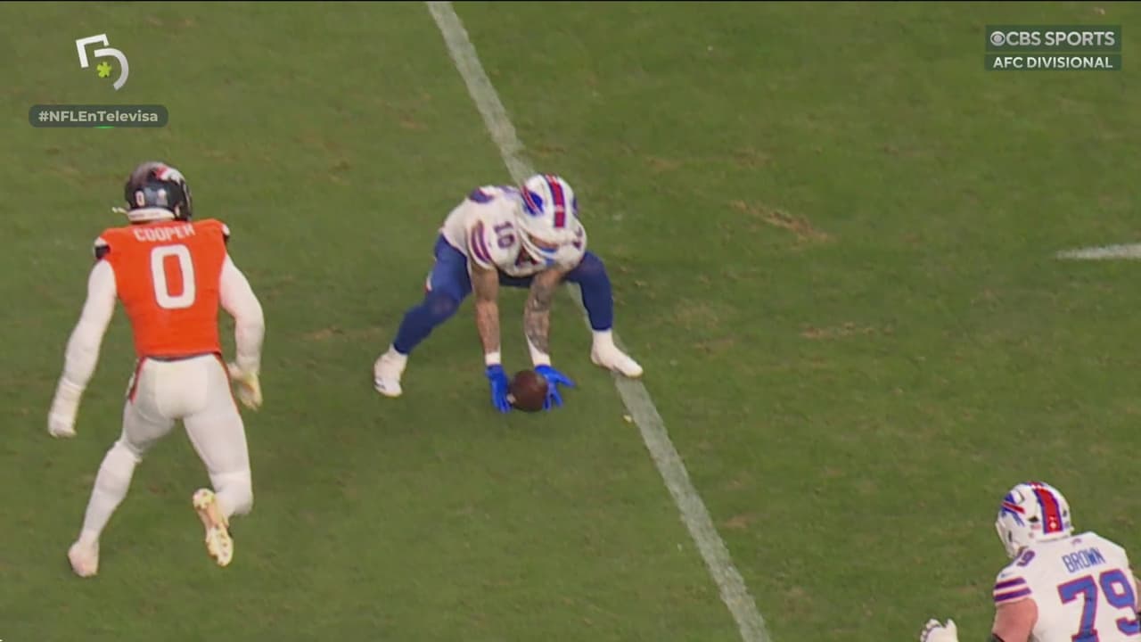 El primer error del juego lo comete Buffalo, James Cook suelta el ovoide tras el impacto del defensivo y lo recuperó Denver.