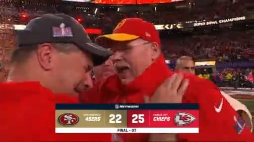 Mahomes lanzó un pase de touchdown de 3 yardas a Mecole Hardman con 3 segundos restantes en tiempo extra, y los Chiefs se recuperaron para vencer a los 49ers, convirtiéndose en los primeros bicampeones del Super Bowl en 19 años y la novena franqicia en general.
