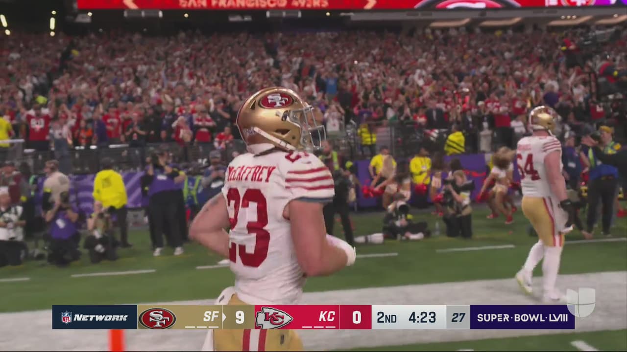 En la primera mitad, Jake Moody rompió la igualdad al firmar el gol de campo más largo de la historia del Super Bowl, 55 yardas, y Christian McCaffrey anotó su tercer 'touchdown' en esta postemporada tras recibir un pase de 21 yardas, no de Brock Purdy, sino de Jauan Jennings, para certificar la superioridad de los 49ers.