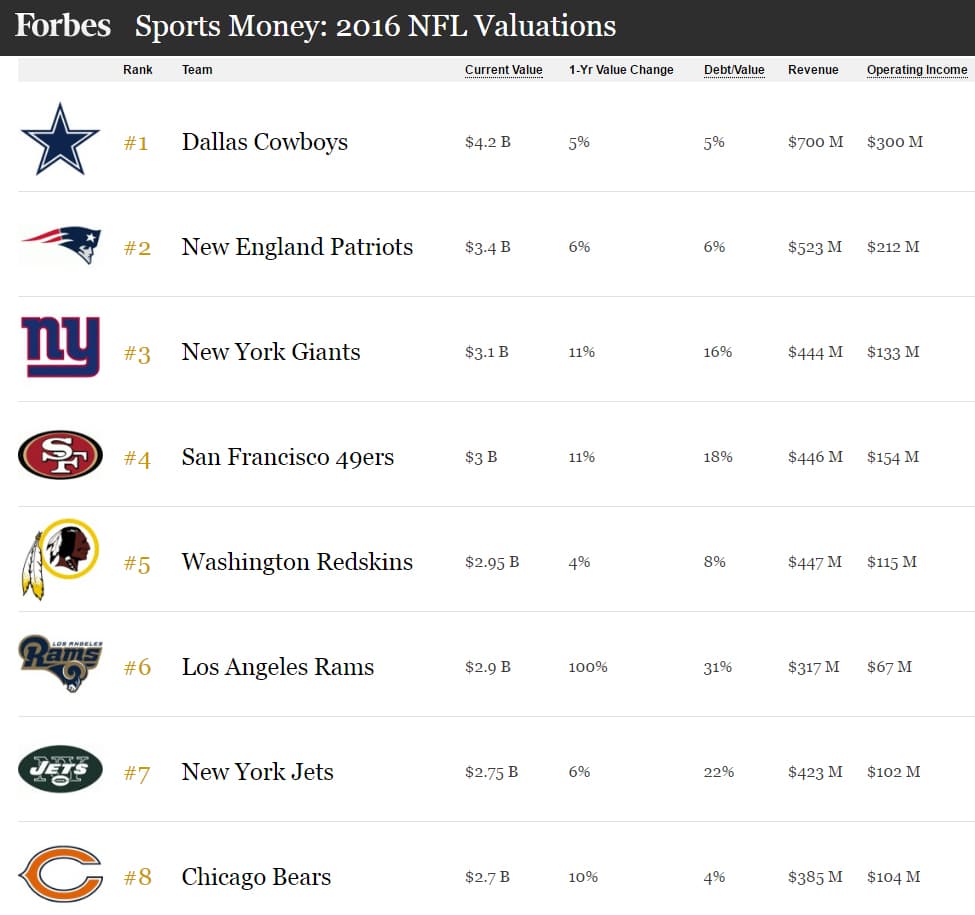 El valor promedio de los conjuntos de la NFL es de $2,340 millones, un incremento de 19% respecto al año pasado. Dicho aumento se debe principalmente a mayores retribuciones por los derechos televisivos de los juegos de jueves por la noche, la reubicación de los Los Angeles Rams, el traslado de los Minnesota Vikings a su nuevo estadio y que los Atlanta Falcons están cerca de concretar el cambio a su nuevo inmueble.