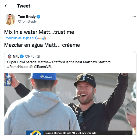 “Mezcla en agua, Matt… créeme”, tuiteó Tom Brady sobre la imagen del mariscal de campo de Rams en el camión del equipo durante el desfile de campeones.
