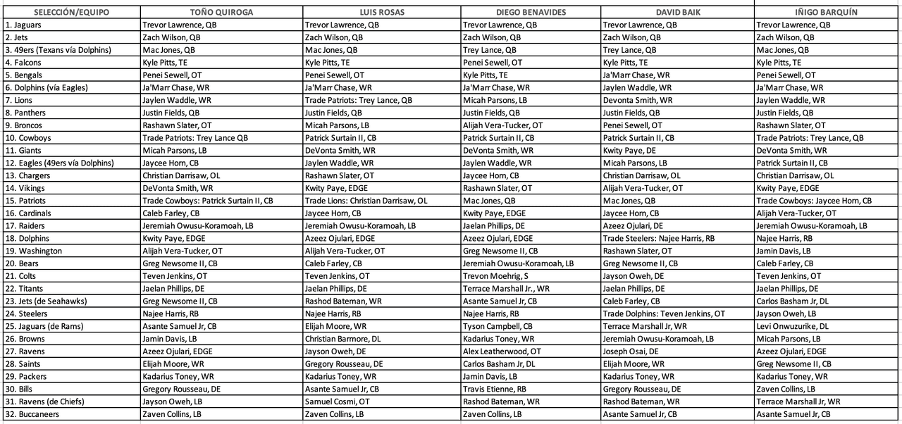 Horas previas al NFL Draft 2021, se mantienen las interrogantes sobre las franquicias que seleccionarán a los mejores prospectos colegiales y como parte de una predicción se creó este Mock Draft con una supuesta elección de los equipos en la primera ronda.