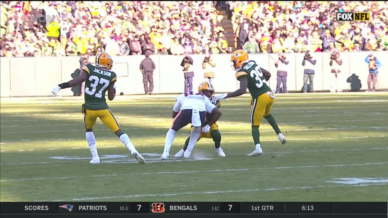Pero arrancando la segunda mitad llegó Aaron Jones para sumar 21 yardas por la izquierda y anotar su 13er touchdown en la temporada. El punto extra de Crosby puso a trabajar al marcador que mostró 3-14.