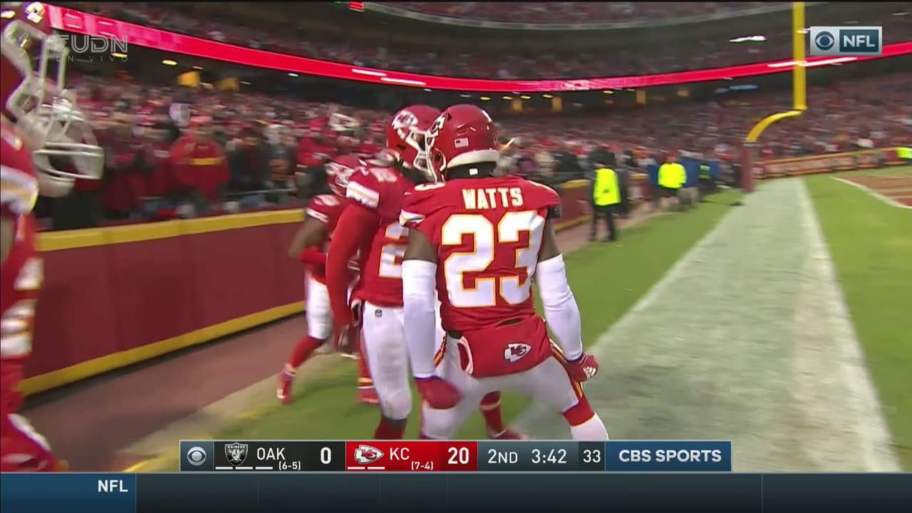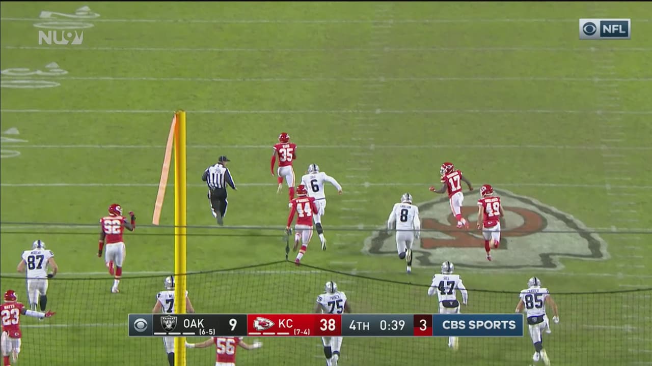 Primero, Harrison Butker sumó tres puntos más para los Chiefs con un gol de campo de 50 yardas. Tras otra serie ofensiva infructífera de los Raiders, Mahomes y LeSean McCoy concretaron el inicio de una barrida con el cuarto touchdown de la noche.