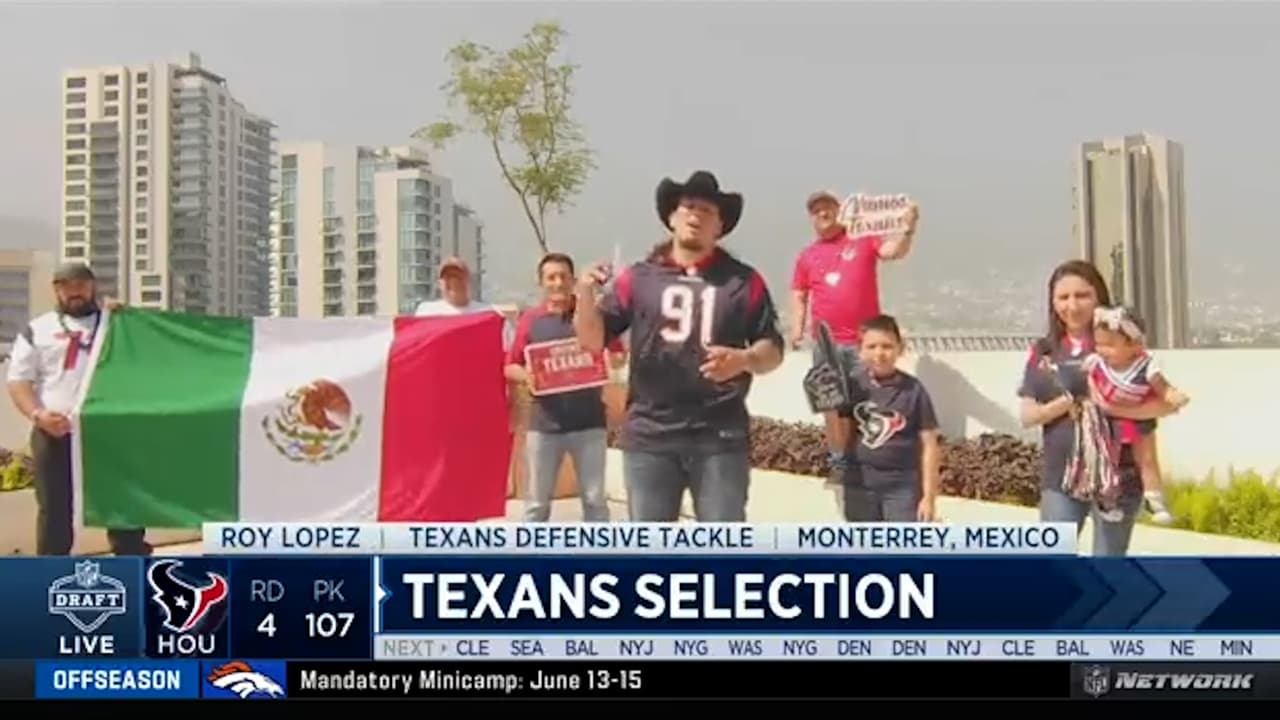 Ahí, el defensivo de los Texans, Roy López, fue el encargado de leer la selección de su nuevo Running Back Daemon Pierce acompañado de algunos aficionados que presumieron en cámara la bandera mexicana.