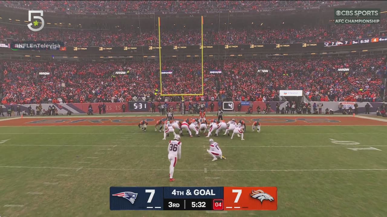 La defensiva de Patriots le bloquea el gol de campo a Wil Lutz y mantienen la ventaja.