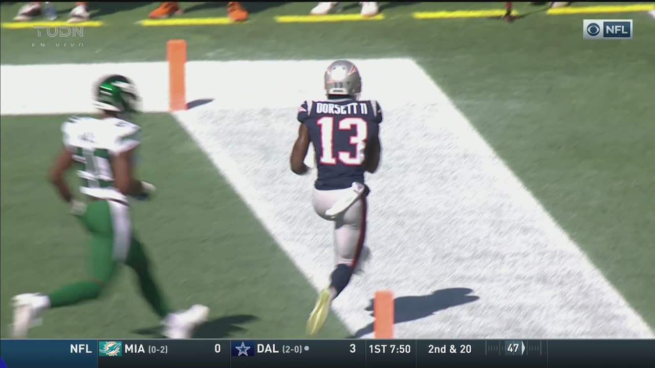 Tom Brady engañó a la defensiva de los Jets y completó un pase de anotación (25 yardas) con Phillip Dorsett, quien consiguió su tercer touchdown de la temporada y puso el marcador 13-0 a favor de los ‘Pats’.