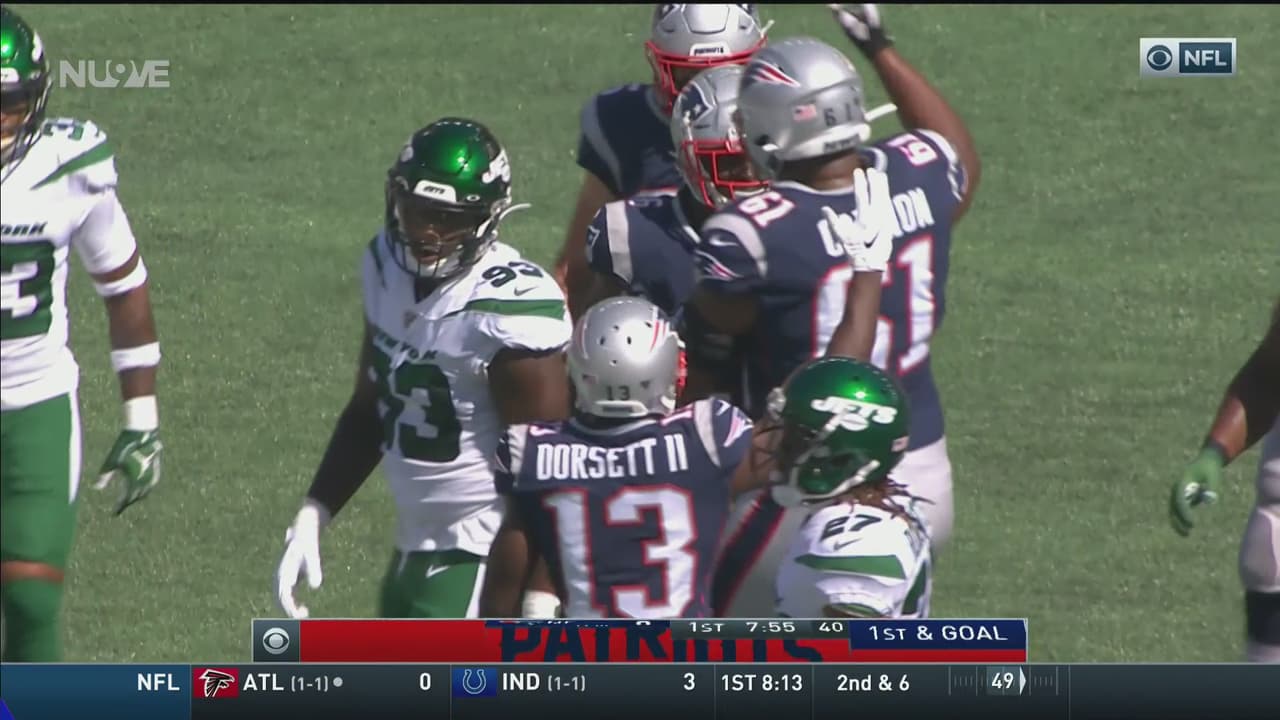 Luke Falk fue interceptado por Devin McCourty, y New England, por conducto de Gostkowski, convirtió un gol de campo de 37 yardas. Más tarde el corredor Rex Burkhead acarreó el balón dos yardas para touchdown y Patriots aumentó su ventaja por 30-0 sobre Jets al final del tercer periodo.