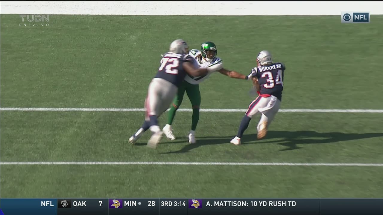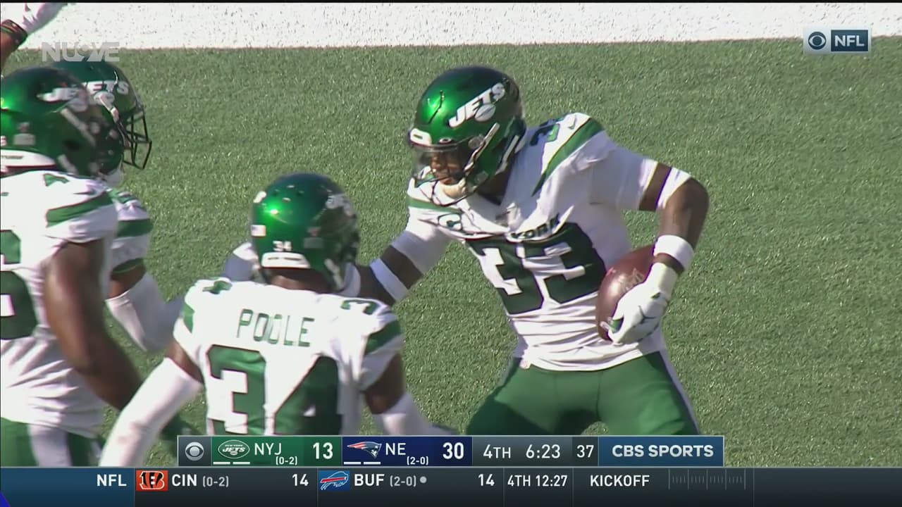 Arthur Maulet aprovechó un error del regresador de patadas de los Patriots, Gunner Olszewski, para recuperar el balón en zona roja y le dio a los Jets sus primeros puntos del partido. New York se acercó 7-30 al final del tercer periodo.